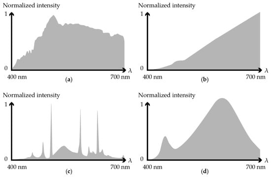 The technical development of interior lighting has resulted in numerous light sources, which can be divided into temperature radiators, discharge lamps and electroluminescent lamps. Before the invention of the light bulb, fossil fuels were used to illuminate rooms, which, based on fire, provided a natural light with a warm white color spectrum of light. Short wavelengths are underrepresented in the spectrum. Therefore, despite a nominal color rendering index of 100, the perception for blue and green colors is limited with the “fire” spectrum. Before the introduction of incandescent light, petrol lamps were used for a long time. Naturally, these caused many fires in public spaces and became dangerous in daily use. The incandescent light brought mainly logistic advantages, as no gas pipes were needed anymore, but a flexible electricity medium was used. Since the light bulb converts more than 87% to 98% of the electrical energy used into heat instead of light [], most further technical achievements were primarily aimed at increasing energy efficiency. Further milestones after the incandescent light were, therefore, far more efficient halogen lamps and energy-saving lamps. In contrast to the light bulb, which offers a rather warm white spectrum, the spectral distribution of light intensity was uneven among these light sources, which were considered to be very innovative at the time [cf. Figure 1c]. Halogen lamps are also incandescent lamps, only operated at a filament temperature of ~3000 kelvin instead of 2700 kelvin, gaining more energy efficiency due to the related shift of the light emission towards shorter wavelengths, compared to light bulbs. In EN 15193-1:2017, a correction factor for taking into account the efficiency of the lighting technology was introduced. Incandescent halogen luminaires are described here with a correction factor of 4.49, whereas the common incandescent lamp has a factor of 6.38. The correction factor for discharge and fluorescent lamps of EN 15193-1 standard lies between 1.01 and 0.90 []. The energy-saving lamps are fluorescent lamps, which existed before as long tubular versions and were engineered to compact versions, which were able to be used as a replacement for incandescent bulbs. They achieve the necessary illuminance by individual peaks in the spectral distribution. Figure 1 compares the intensities in individual wavelength ranges of the visible and near nonvisible spectrum of different light sources. Incandescent light bulbs (temperature radiators) emit light in the entire visible range of the spectrum with high intensity in the range of long wavelengths. Due to their poor efficiency, incandescent lamps are rarely used in lighting systems today, especially because the market for incandescent light bulbs in the European Union (EU) has been limited in order to meet climate protection targets []. Fluorescent lamps (discharge lamps) produce light when electrical current passes through an ionized gas or metal vapor. Discharge lamps are divided in two categories. Low-pressure discharge lamps are producing mercury emissions in a first step. The UV proportion of the emission from mercury is converted into visible light at a phosphor coating on the inside of the tube. This produces a mix of residual emission lines from mercury in the visible part and a broader emission from the phosphor. By changing the phosphor composition, the light color of fluorescent lamps can be adjusted. The second category is high-intensity discharge lamps. They are operated at high temperatures, causing vapors of metal halides in the discharge vessel. The metal atoms and ions are excited and radiate typical emission lines for these metals. In most cases, these are rare earth metals, with a multitude of spectral lines, giving the impression of a quasi-continuous light emission. They emit a light that is distributed unevenly over the visual and nonvisual spectrum and differs vastly from the daylight spectrum. Discharge lamps are the still state of the art for the illumination of industrial halls and functional buildings. Slowly but surely, fluorescent lamps are leaving the market. Sales have fallen sharply. In 2014, for example, 1.96 million energy-saving lamps were sold in Switzerland; in 2019, though, it was only 0.32 million pieces [].