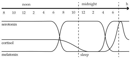 Circadian rhythm of the endogenous hormones serotonin, cortisol and melatonin during the course of the day (simplified and dimensionless); serotonin is mainly present in the daytime, while melatonin is present at night and during the time just before falling asleep. Cortisol has a peak shortly after awakening.