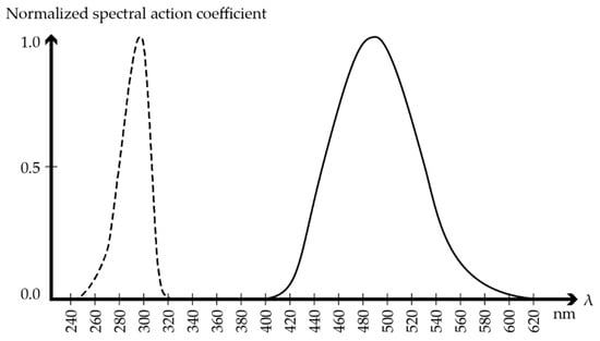 The eyes are not the only organs that interact with electromagnetic rays. When ultraviolet radiation hits the skin, pre-vitamin D3 is produced in it. An action spectrum from 250 nm to 330 nm, peaking at 298 nm is documented in DIN 5031-10 [cf. Figure 3, dashed line] []. If exposure to UV-B radiation is prolonged, pre-vitamin D2 is converted into trachysterol2, with the highest action spectrum at 282 nm. Together with other endogenous hormones produced by the liver through the addition of nutrients, provitamin D3 is eventually synthesized []