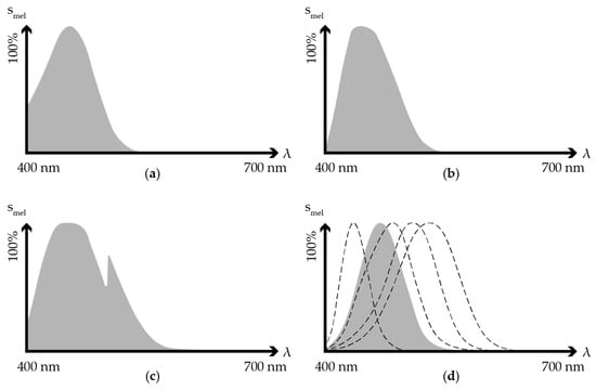 Optical comparison of selected research findings in the rage of 400 nm to 700 nm: (a) distinct curve based on numerous subject trials by Brainard et al. (simplified) []; (b) slightly asymmetric curve by von Gall, which was adopted in DIN V 5031-100 (simplified) [,]; (c) specified effect curve of Rea et al., which is based on a mathematical modelling (simplified) []; in the range of 500 nm, the curve shows an unusual expression (snap-action function); (d) curve pairs of Lucas et al. based on laboratory tests and mathematical modelling which was adopted in CIE TN 003:2015 (simplified) [,]; dashed lines: spectral action of the other photoreceptors.
