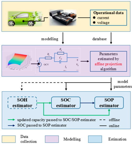 The SOP is the parameter used to describe the maximum charging and discharging capabilities of the battery, which is usually constrained by multiple thresholds such as voltage limits, current limits and SOC limits [17]. The equivalent circuit model (ECM)-based approach is currently the most widely applied method in SOP estimation, as in Refs. [18,19]. To ensure the estimation accuracy in a wide range of different working conditions, the adaption of model parameters is required as SOP is heavily related to them.