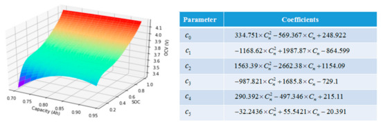 where np represents the polynomial order of OCV with respect to SOC [28,29]. ci represents the polynomial coefficient and it is the two-order polynomial function of capacity Cn. Figure 3 shows the detailed value of parameters ci based on the HPPC test. The polynomial coefficients in Figure 3 are calibrated based on HPPC tests under different aging states. At a specific degradation level, the OCV-SOC coefficients can be determined using the method introduced in Section 4.1 below, then combing all the OCV-SOC coefficients in different aging levels with calibrated capacity, the polynomial coefficients in Figure 3 can be derived.
