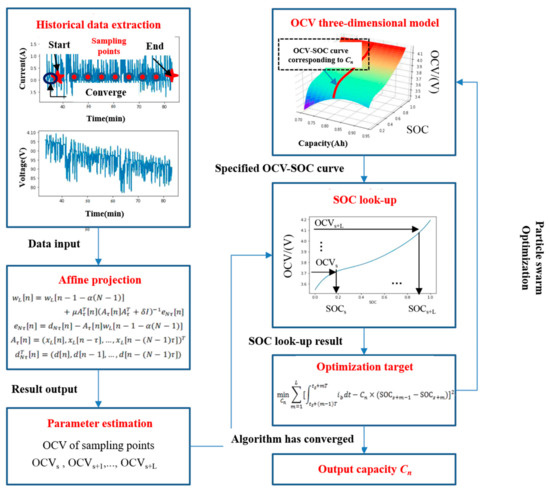 Figure 4 demonstrates the framework of the proposed SOH estimator. The estimation process can be expressed as follows: First, historical data of the last driving event, including battery current and voltage, are extracted. Then, several sampling points, which are evenly distributed between the start and end points, are selected for OCV estimation using the AP algorithm. It needs to be noticed that the start point here does not mean the first point of the historical data. Because the initial OCV guess may deviate from the true value largely, a relatively reasonable length of data after the first point is left out for OCV estimation convergence. At last, the following target function is minimized by combining the three-dimensional response surface OCV model and PSO algorithm to give the capacity estimation as Equation (19) [32]: