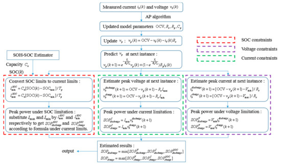 For safe and durable operation, the working current, voltage and SOC of lithium-ion batteries must be restricted within a suitable range [35] and battery power (positive for discharge and negative for charge) will be limited by these restrictions. The flowchart of the proposed SOP estimation algorithm is shown in Figure 5. It needs to be noticed that the SOH-SOC estimator provides reliable battery capacity and SOC values to the SOP estimator so that the SOP limits under the SOC constraint can be achieved with high confidence. Detailed descriptions are as follows [36].