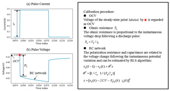 Accurate estimation of the model parameters is significant for the subsequent state estimation [38]. To evaluate the performance of the proposed estimation algorithm, the model parameters calibrated from the HPPC test are worked with as the benchmark. The calibration procedure covers the following three steps, which are shown in Figure 6:
