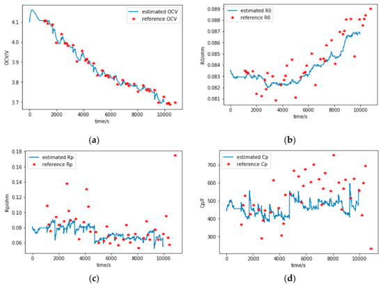 Parameter identification results of the proposed method. (a) OCV; (b) ohmic resistance; (c) polarization resistance; (d) polarization capacitance.