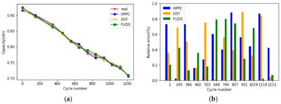 In order to verify the accuracy and adaptability of the proposed SOH estimator, Figure 8a plots the SOH estimation results under HPPC, DST and FUDS tests. It is obvious that the estimated SOH results under three different excitations are close to the real value, which is calibrated by the coulomb counting method. In order to better demonstrate the accuracy of the SOH estimator, Figure 8b gives out the corresponding relative error. It can be seen that the relative error is under 1% for all aging states under three working conditions. The mean relative errors for HPPC, DST and FUDS at different aging levels are 0.51%, 0.46% and 0.39%, respectively, which verifies that the proposed method has desirable accuracy and adaptability performance against different loading profiles under all degradation levels. In addition, considering the slow-varying characteristic of capacity decrease, the SOH estimator does not need to be implemented online. It can be triggered every month offline to calibrate the capacity when the BMS is relatively free. Accurate SOH estimation provides the following SOC and SOP estimators with good estimation bases.