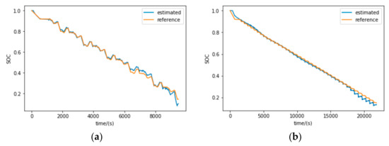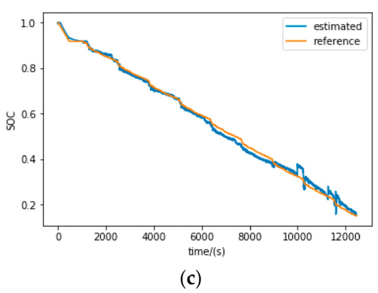 Figure 9b,c show that the SOC estimation results under DST and FUDS tests and the mean SOC estimation errors under these two working conditions when SOC is above 15% are 1.04% and 1.31%, respectively. The same phenomenon that the estimated SOC accuracy is desirable in high SOC range and deteriorates in lower SOC range can be observed, with the same reason as explained in the HPPC test above. Generally, the satisfactory performance of the SOC estimator under HPPC, DST and FUDS tests verifies its robustness to different working conditions.