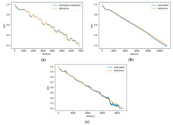 Figure 9 plots the SOC estimation results for the fresh battery under HPPC, DST and FUDS working conditions. According to Figure 9a, the mean estimation error for the fresh battery under the HPPC test when SOC is above 15% is 1.13%. It can be seen that when SOC is above 50%, the estimated SOC is very accurate and the mean estimation error in this range is only 0.51%. However, when SOC drops below 40%, there are some instants when relatively large distinctions exist between the estimated and reference values. This may be caused by the change of battery dynamic proprieties when it is close to the deep discharging state [37]. However, considering the SOC of the battery in electric vehicles rarely drops below 25% and the maximum estimation error when SOC is above 25% is 3.45%, the proposed estimation method is feasible in real-world applications.