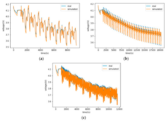 Because the battery experiment described in Section 3 does not incorporate the above SOP test procedure, we use the battery model with parameters identified based on the HPPC test to simulate the above test process. Therefore, the accuracy of the battery model is significant for SOP validation. Figure 11 plots the voltage response of the identified battery model (Number 20, fresh) against the measured values. Overlap of the real and simulated voltage response indicates that the identified model is very accurate. The absolute mean voltage errors under HPPC, DST and FUDS tests are 13.41, 9.40 and 9.46 mV, respectively.