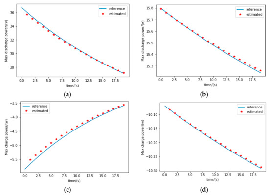 The SOP given by simulated experiments and the proposed SOP estimator under discharging and charging situations are shown in Figure 12. For the discharging simulation, the initial SOC is set to 0.3, the voltage and current limitations are set to 2.5 V and 4.7 A, respectively. For the charging situation, the initial SOC is set to 0.9, the voltage and current limitations are set as 4.2 V and −2.35 A, respectively. The closeness between the estimated SOP and the reference value in Figure 12 validates the effectiveness of the proposed SOP estimator.