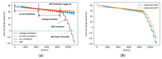 For a better understanding of the three different limitations’ influence on SOP, Figure 11a plots the maximum discharge power constrained by voltage, current and SOC limitations respectively, together with the final SOP determined by all the above constraints. The test is simulated based on the battery model derived from the HPPC test of the battery after 744 aging cycles. It can be seen that, at first, the SOP is determined by current limitation as SOC and voltage at this time are far away from their corresponding lower cut-off value. After about 4000 s, SOP turns out to be determined by voltage limitation as the OCV decreases. When the discharging process further continues, the SOC limitation is triggered and becomes dominant in deciding the final SOP. As SOC decreases to the lower cut-off value, the SOP becomes negative as labeled in Figure 13a. Figure 13b compares the estimated SOP based on the proposed method and the calibrated SOP derived from the battery model. In general, the estimated SOP can track the calibrated value well. The absolute mean error of SOP estimation is 2.69 W. The SOP estimation error at a higher SOC range is mainly caused by the parameter estimation error and is relatively small when current and voltage limitations dominate the SOP value. When SOC limitation is triggered, the SOP estimation error becomes larger as SOC estimation is less accurate when the battery is in the deep discharging state. Because the estimated SOC is lower than its true value after around 8000 s (as shown in Figure 10b), the estimated SOP is correspondingly lower than the calibrated value.