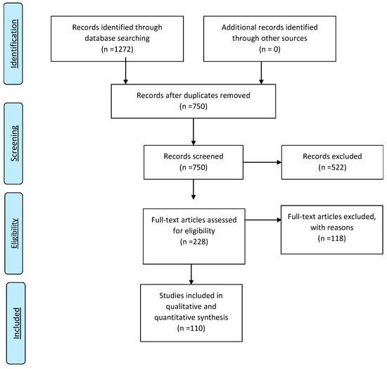 The authors followed in their literature review the PRISMA guidelines [21], as illustrated in Figure 2. Google Scholar, Web of Science, Scopus, Ebsco, and ProQuest databases were visited to identify literature related papers. The research has yielded (n = 1272) articles, and records after duplicates removed (n = 750) using Endnote X9. A total of 522 articles were excluded based on the exclusion criteria. Exclusion criteria are book chapters, papers that upon review were not related to the research questions, opinions, viewpoints, anecdotes, letters, and editorials. After excluding articles based on criteria, we included 110 articles that are studies in qualitative synthesis and studies in quantitative synthesis. Inclusion criteria are written in English, peer-reviewed, and identify, describe, or use empirical and/or model graph.