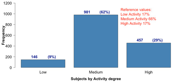 The Q2-2020 term, which was affected by quarantine, had 78% active subjects of a total of 2022. This means that 78% of subjects were active with at least one action during the period. As a starting point, subjects are classified according to the level of activity (K5, see the definition in Section 2.2). Table 5 (rows 1 to 3) shows what this definition means in present case. Figure 1 shows that only 8% of subjects had a low level of activity and, in contrast, 29% of the subjects were highly active.