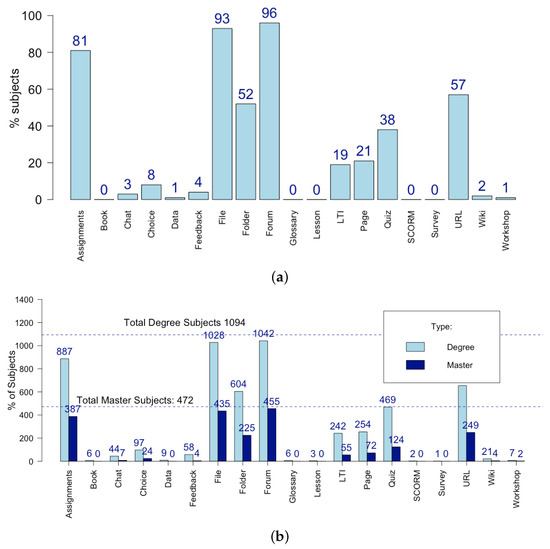 With respect to percentage of subjects that use resources and activities, the most frequent were forum, files, and assignments—with 96%, 93%, and 81% of subjects using them, respectively. The resources folder and URL were also used in a significant number of courses (see Figure 2). The use of data, workshop, book, glossary, lesson, SCORM and survey was residual, with less than ten subjects using each. Moreover, the situation is similar when master and degree subjects are compared: forum, files, and assignments also led in the ranking of subjects using these resources (see Figure 2).
