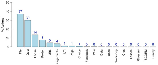 Being related to the resources and activities used (load/create/send), Figure 3 shows the percentage of each type of action per subject performed during this period in the virtual learning environment. The use of files (37%), quizzes (30%), and forum (14%) can be highlighted as the main actions performed per subject. Note that each question in a questionnaire counts as a quiz. Taking this into account, the number of quizzes used is not especially meaningful, and one can conclude that files were the preferred resource for providing information and material. The use of forum was also important during quarantine, as it represented a communication channel between lecturers and students. Although assignments are used by most subjects, its use within specific subjects is not intensive.