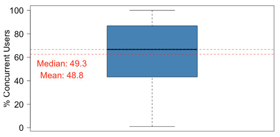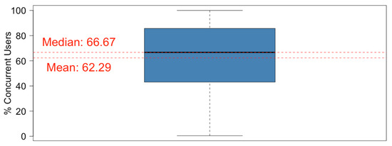 The number of concurrent users for a subject was saved (ES data, see Section 2), and this included the maximum number of users connected per day. That number during a specific period was calculated in the same way as the maximum value for all days in the period. Boxplot is a useful graphic to plot this: the box collects 50% of the central data, the middle line is the median, the whiskers give an idea of variability, and the points are considered to be outlier data. The boxplot of concurrent users of all subjects (see Figure 4) shows that more than 50% of subjects had more than 67% of concurrent users, as its median is almost 67. The boxplot also shows that 50% of subjects had between 45% and 95% of concurrent users. The mean shows us that the average number of concurrent users per subject is nearly 63 students. The mean and median value were nearly matching, and so the concurrence was very homogeneous for all subjects.