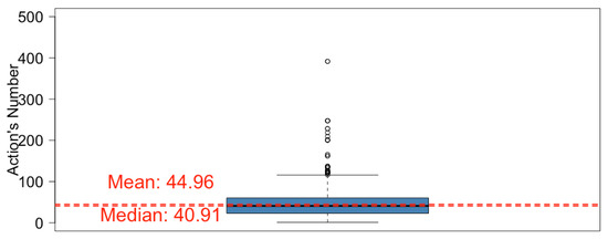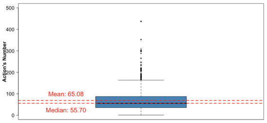 The average number of actions per user was obtained for each subject. The mean, median, and maximum were calculated (see Table 7). There was a significant increase in the mean value: a user passed from 45 to 65 actions per subject. The length of the box also changed (this is the range that includes 50% of subjects), as can be deduced by comparing Figure 5 and Figure 14.