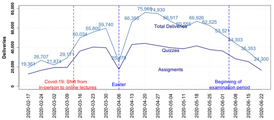 The analysis is applied to the Universitat Politècnica de Catalunya data during the pandemic term with online teaching (second term of academic year 2019–2020). The data made available were restricted. A thorough study and analysis of the indicators shows how valuable information can be extracted from the overall data. Students have generally responded very well to the demands of lecturers by working online, with the results obtained in a sustained and seemingly natural manner during the course. The correlation coefficients for all of the centres measured between 0.8 and 0.95—which reveals that the centres were sincronized and making continuous evaluations. Surprisingly, there is a sharp increase in deliveries by students during the first week of quarantine, multiplying by 1.7 and the volume of deliveries increases week after week for five consecutive weeks until reaching 2.5 times before online teaching. A considerable amount of work was produced, even in Easter week.