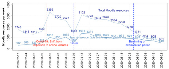 Moodle provides much more information, which monitors the functioning of the Atenea virtual campus. Specifically, during the limited period of online classes from March to July 2020, the UPC stored additional data by center and week (see Table 2), including total use of resources/activities and the use of most common deliverables: quizzes and assignments.