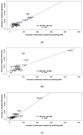Figure 8 shows three cases, one before the quarantine with a high value of and two during quarantine: one with (week 20 April) and another with a higher value (week during the evaluation period). Even in the worst case shown (week 20 April), the level of response of students to the actions of lecturers is good in all centres, as responses from all of the centres are near the line. The school centres with the most students (EEBE, ESEIAAT, and ETSEIB) led the deliverables and appeared to be separate from the rest of the centres, which seems reasonable. The ESEIAAT centre led deliveries during quarantine.