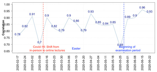 The engagement is measured by looking into the correlation coefficient per week. The correlation coefficients that are plotted in Figure 9 are high, indicating strong linear dependence between the two variables. As expected, this is more evident at the evaluation period with higher values (>0.9).