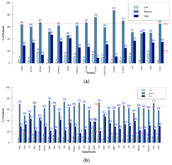 Figure 10 clearly shows a difference in the behaviour of the school centres and departments with respect to activity levels. All of the units have a percentage of low activity subjects below 16%. One centre (FME) leads the percentage of highly active courses, with 56% and no courses with low levels of activity, while another centre (ETSEIB) shows 88% of courses with medium levels of activity and 2% with low levels. The MAT department stands out among the departments that show variations—with 47% being highly active courses and only 2% of courses with low activity levels.