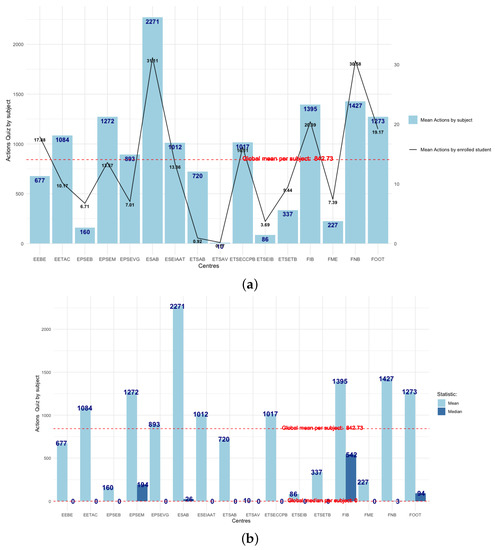 However, the number of students in each school centre must also be considered before drawing appropriate conclusions and the number of students per subject also varies greatly—with some subjects reaching 500 students. For this reason, the number of actions per student and subject, on average, is also plotted (see Figure 11a). The centre with most actions per subject is also leader at the UPC, with 31 actions per user on average. In contrast, another centre (FNB) shows less intensity, but has the same number of actions per user (31). The interpretation for this is either that there is a difference between the two centres with respect to the number of students enrolled, or that questionnaires at the ESAB include more questions. The mean number of enrolled students by subject is similar in both centres: 34 at the FNB and 26 at the ESAB, so the latter is the explanation.