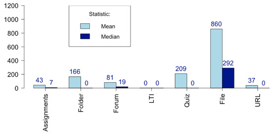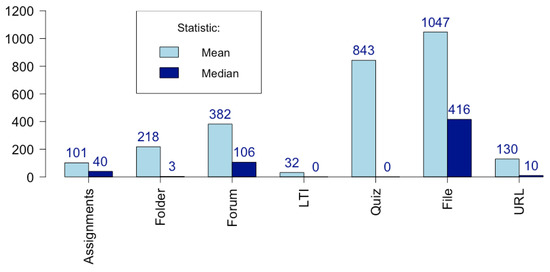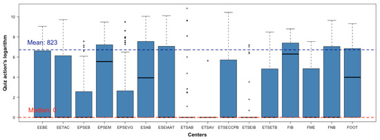 To better understand what happens, we need to know more; perhaps there is one subject with a huge use of questionnaires that overlaps the rest. As the mean is not a robust statistic, we need to add the median to gain a better understanding (see Figure 11b). In the ESAB school centre, there is a major difference between mean and median (2271/26), most likely due to some subjects making great use of questionnaires (50% of subjects asked less than 26 questions). There is one school centre (FIB) with a more homogeneous use of quizzes within subjects—with 50% of subjects with more than 542 questions asked and 21 questions per user and subject.