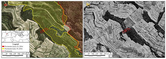 At 21:00 h on 23 June 2016, a fire broke out in the vicinity of Rocallaura, caused by a firecracker set off by a child during the San Juan festivities. It affected 103 ha of forest and agricultural land [22,23]. The temperature was 22 °C, relative humidity was 33% and the wind speed was 9 km/h with gusts of up to 21.4 km/h in a N-NW direction. Weather conditions were adverse: there had been no rain for several days (2.5 mm on 18 June), relative humidity was between 25 and 40%, average temperatures were between 23 and 24 °C and the average daily wind speed had increased from 5.4 km/h to 9 km/h in 3 days [24,25]. Less than a month later, re-ignition occurred in the same study area. See more details in Xifré-Salvadó et al. [16].