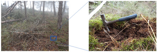 The trees are about 70–80 years old, as the forest was last felled or burnt during the Spanish Civil War (1936–1939). A line of old war trenches in the area has restricted forest management from that time to the present day because of the risk of explosion of remaining unexploited artefacts. Rural depopulation, climate conditions and limited forest management has led to a surface layer of moss growth and an increase in soil organic matter content in low-gradient areas (Figure 3).