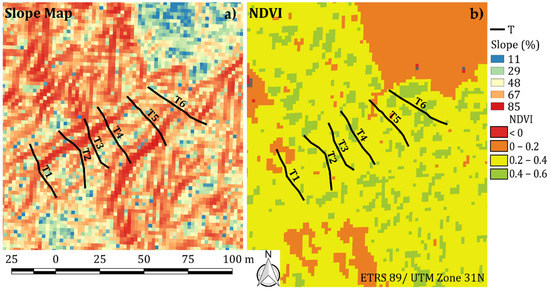(a) Slope map (%) of the study area and (b) NDVI (Normalized Difference Vegetation Index) from 2012. T indicate Transects. Compiled by the authors from [18,19].