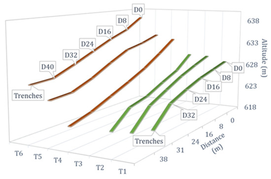 Diagram of the transects designed for the Rocallaura fire according to the distance of each transect (D0, D8, D16, D24, D32, D40) and its slope. T1, T2, T3 indicates the transects in the unburnt (control) area while T4, T5, T6 indicates those in the burnt area. Modified from Xifré-Salvadó 2020 [16].