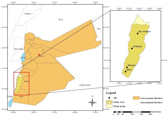 WA is a 2000 km2 arid environment that extends 170 km from the southern Dead Sea shore (elevation of 400 m below sea level) to the Gulf of Aqaba at the Red Sea (130 m above sea level) and constitutes 2.4% of the total area of Jordan [19]. WA consists of six large communities, which form a population of 10,510 people living in 1911 households [26]; moreover, WA is close to Aqaba and Petra cities, which form the famous Jordan’s Golden Tourism Triangle. The WA region suffers from surface water scarcity due to low rainfall rates and the absence of valleys or torrents of permanent flow in the region. Employment opportunities within WA consist of grazing livestock, agriculture, and making handmade textiles, and there are few people who work in government jobs [27]. In the southern part of WA, four study sites of Rahamh, Qatar, Al-Reshah, and Beir Mathkour were selected for hosting 50% of the population and for the diversity of ESs in these locations. The total population of the study sites is about 5459 people, and the total number of households is 820, with an average family size of 6–7 people per household [27].