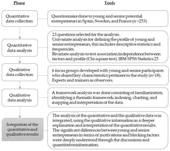 According to several authors who have analyzed entrepreneurship research publications [85,86,87,88,89,90] entrepreneurship research is dominated by quantitative methods [91]. They argue that qualitative methods are increasingly less preferred for publication than quantitative methodologies. However, the application of qualitative approaches might facilitate a deeper understanding of the topic in this field of study [91,92] and enrich the conclusions provided by quantitative methods [93,94]. A mixed methodology was adopted for our study to achieve the objective of identifying the differences and complementarities between young and senior entrepreneurs. Mixed-methods research combines qualitative and quantitative data collection and data analysis within a single study [95]. The two methods reinforce each other to provide the most informative, complete, balanced, consistent, conclusive, and useful framework [96].