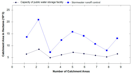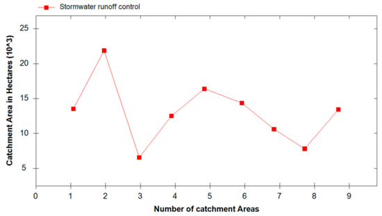 Figure 3 depicts stormwater runoff control in the catchment area (in hectares) with respect to the number of catchment areas. This figure reveals that more catchment area is required if the number is less to control the stormwater runoff; however, if we increase the number of catchments, the less area can control the runoff stormwater. A comparison is presented in Figure 4 that reveals the stormwater runoff control in total compared with the capacity of public water storage facilities in the catchment area.