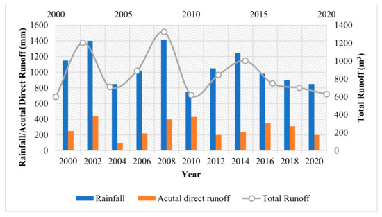Scenario of rainfall, actual direct runoff and the total runoff from year 2000 to 2020.
