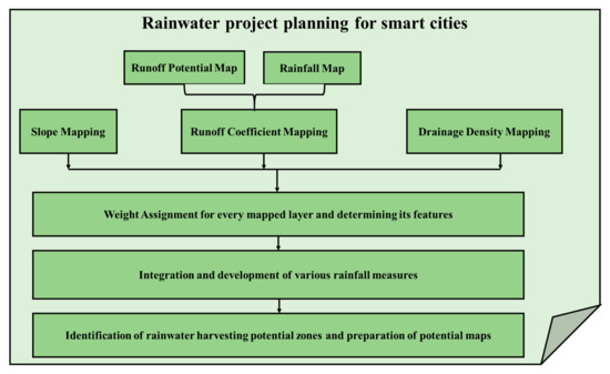 Multiple factors should be considered for rainwater harvesting and the management of water flow in smart cities. These factors include the optimal utilization of existing resources, anticipation of future demand, and analysis of the impact of climatic changes over the approaching years. The design of rainwater project planning for rainwater harvesting in the smart cities is depicted in Figure 7.