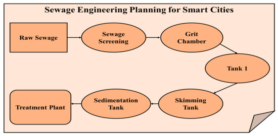 An effective sewage management system plays a vital role in the establishment of a smart city. The sewage planning is accomplished by initially performing the screening process, then categorizing the sewage into grit chambers, followed by its passage to the skimming and sedimentation tank prior to processing it in the treatment plant. Figure 8 depicts sewage engineering planning for smart city designing of an urban rain flood ecosystem.