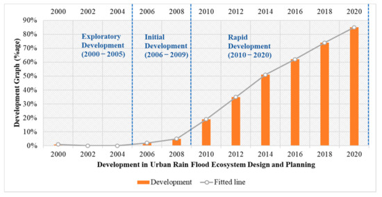 The entire scenario of development for urban rain flood ecosystem design and planning in smart cities is depicted in Figure 9. This indicates the development graph revealed from various literatures from the year 2000 to 2020 in the field of urban rain flood ecosystem development and planning. The outcomes obtained by the survey indicates that the exploratory development is seen between the period 2000 to 2005 which is followed by the initial development between the year 2006 to 2009 and rapid development can be seen from the graph of year 2010 to 2020.