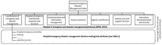 As shown in Figure 1 and aligning with the research aim on assessing the disaster preparedness of the hospitals, the HEDM index consists of 40 items (Module 4 in HSI), which are classified into seven dimensions: (1) coordination of emergency and disaster management activities, (2) hospital emergency and disaster management response and recovery planning, (3) communication and information management, (4), human resources, (5) logistics and finance, (6) patient care and support services, and (7) evacuation, decontamination and security. All the attributes are presented in Table 1. This index evaluates the level of the preparedness of a hospital and its personnel, and of its essential operations to provide health services in response to an emergency or disaster.