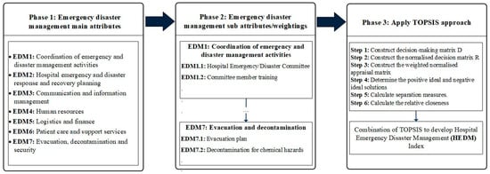 Figure 2 presents the three phases of the TOPSIS technique for its application in Indonesian hospitals. Seven emergency disaster management main categories for developing HSI are proposed in Phase 1, and those seven attributes have been further broken down into 40 sub-attributes as input criteria for TOPSIS. In Phase 3, we consider the expert evaluation on each sub-attribute by applying the TOPSIS method.