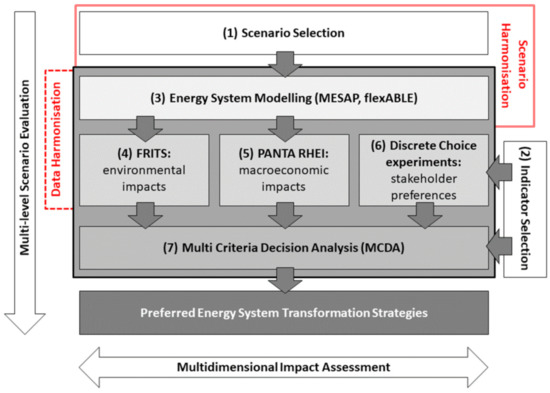 First, the multi-level scenario evaluation, which comprises the “classical” techno-economic perspective based on energy system modeling, is performed. This is followed by an extensive multidimensional impact assessment and a subsequent comparative evaluation of different transformation strategies with an MCDA. The multi-level scenario evaluation thus integrates different assessment levels into one consistent approach.