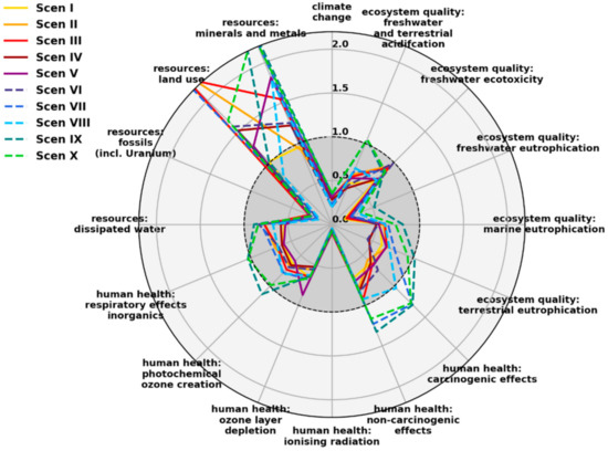 The full set of the 23 selected indicators is documented in Figure 2 below. It comprises 16 environmental indicators (in the sub-categories climate change, human health, ecosystem quality and resources) that have been compiled for the European environmental footprint version 2 [61]. However, the indicator for mineral and metals resources has been updated, according to [62]. In addition, six socio-economic indicators and one socio-technical “systemic” indicator were selected (see Supplementary Material for details).