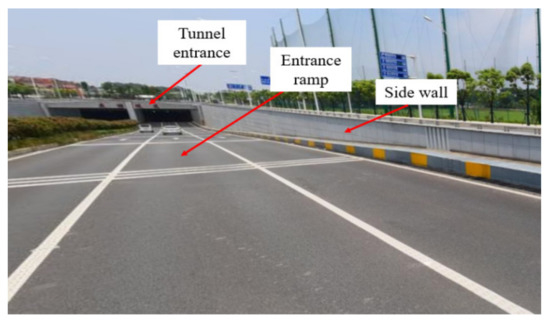 The real vehicle experiment was conducted in an urban underpass in Wuhan, China, during the peak period of 9:00 to 11:00 a.m. on weekdays under good weather conditions to minimize the interference of surrounding vehicles on the drivers’ fixation and saccade behaviors. Carrying out the experiment on weekdays can reduce the variables of traffic flow between weekdays and weekends. The alignment of the tunnel entrance and the division of road sections used in this study are shown in Figure 1 and Figure 2.
