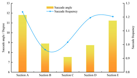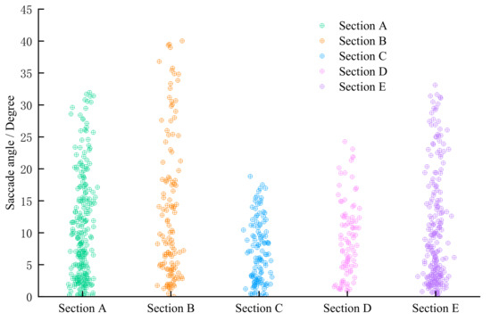 Figure 5 shows that Section C had the lowest saccade angle, Section A had the largest, and the overall distribution was Section C < Section D < Section B < Section E < Section A. It should also be noted that the trend of the maximum value of each section was the same. The saccade angle of Section A was 1.570 times of Section C, which was 2.027 for standard deviation. This means that the saccade range and dispersion of the external straight-line section were stronger.