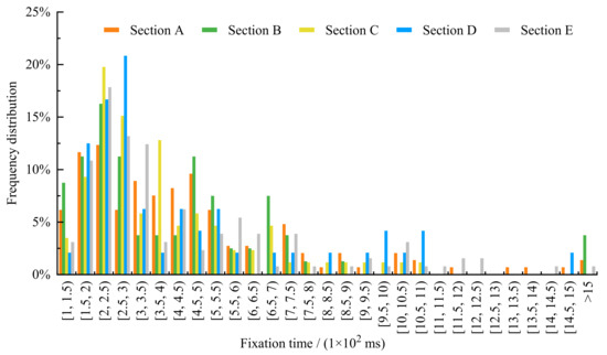 The fixation time became longer with the increasing difficulty of target information processing. The fixation distribution, on the other hand, becomes denser with the increasing complexity of cognitive activities [26]. The driver’s fixation time was analyzed for all sections at 50 ms intervals. Figure 6 shows the frequency distribution of fixation time in different sections.