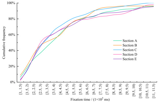 Some studies on driver’s fixation time threshold showed that the fixation time should not be less than 100 ms [27], while others claimed that the minimum fixation time should be at least 200 ms [28]. Hence, it is necessary to investigate the reasonable threshold range of the fixation time in different sections of urban underpasses to improve the safety at their entrance. Figure 7 shows the cumulative frequency of fixation time in different sections.