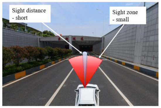 As shown in Figure 1, the tunnel entrance is composed of the external straight-line section, the entrance ramp section, and the entrance internal section. The sidewall of the ramp becomes higher when it gets closer to the tunnel portal, i.e., the shorter the sight distance, the smaller the sight zone. To study the visual characteristics of each road section combining alignment characteristics, considering the road environment such as straight line, downhill ramp, shading shed, and tunnel, the entrance ramp section is divided into upper and lower halves and the tunnel entrance internal section is divided into the shading shed section and the entrance inner section. The red and blue sectors in Figure 2 respectively show the driver’s sight zone and sight distance in different road sections.