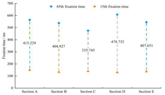 Considering all road sections, the range occurred between the lowest value of the 85th fixation time and the maximum value of the 15th fixation time, which were 475.414 ms and 149.476ms, respectively. In other terms, when entering the tunnel, the driver’s fixation time in each section was in the range of 149.476 to 475.414 ms.